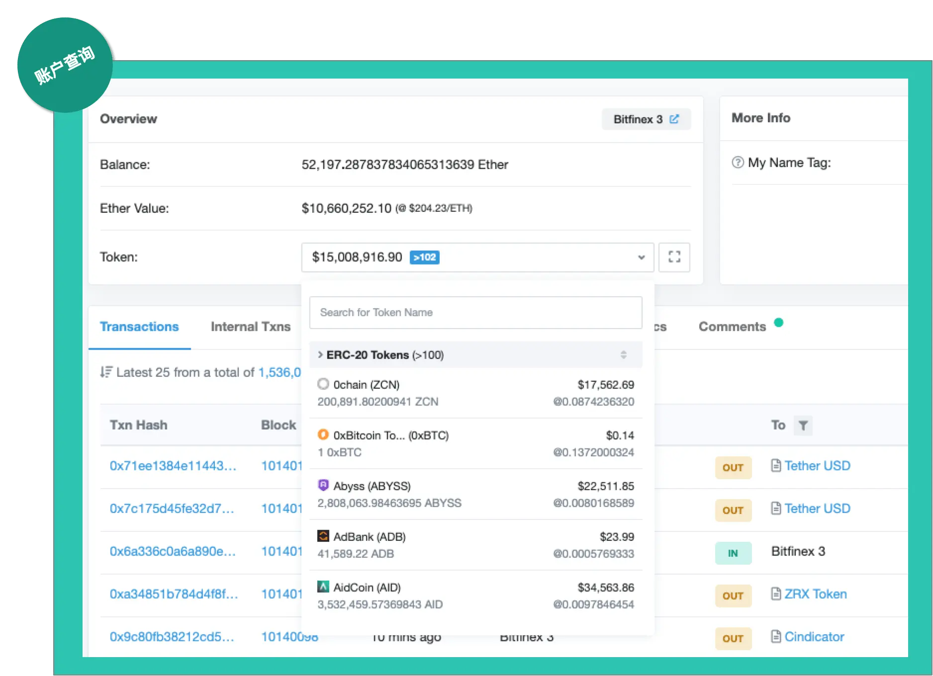 以太坊采用的 Account Model 很好理解,就好像人人都有自己的账户一样。在以太坊的世界里,余额就直接保存在账户地址中,使用区块链浏览器就可以非常直观的查询每笔一交易的细节;