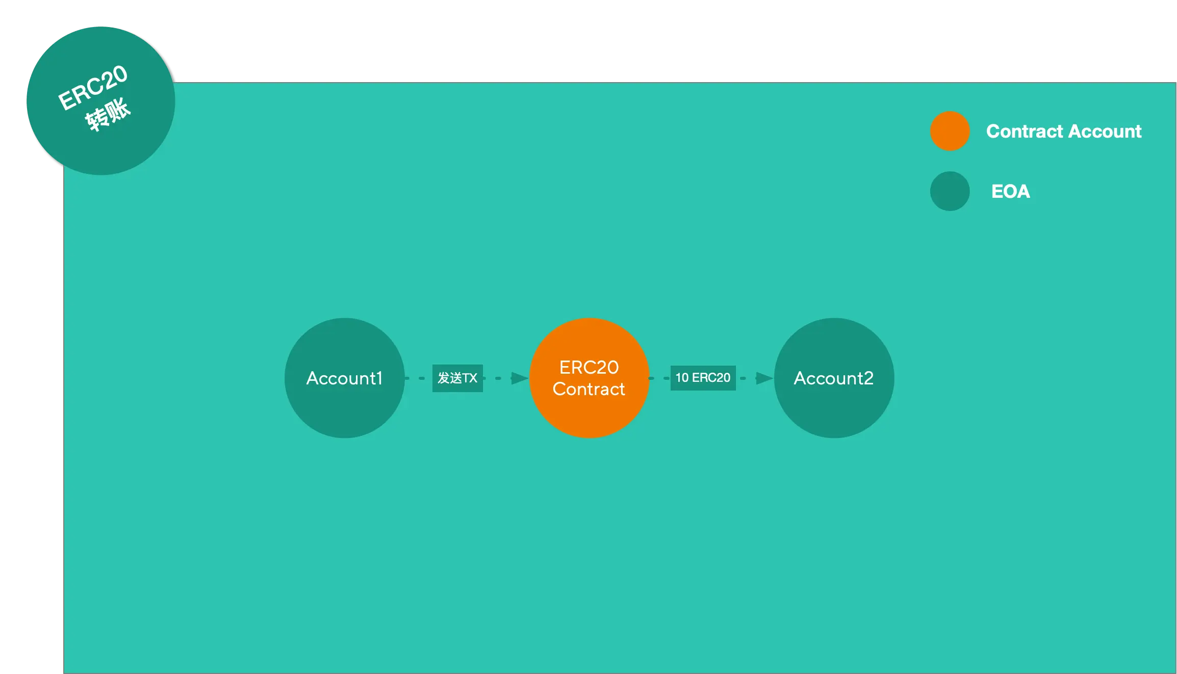 EOA –> Contract –> EOA, 最典型的场景就是 ERC20 转账。这里要注意,ERC20 本质上是 EOA 账户调用智能合约的 tranfer 或 transferFrom方法。