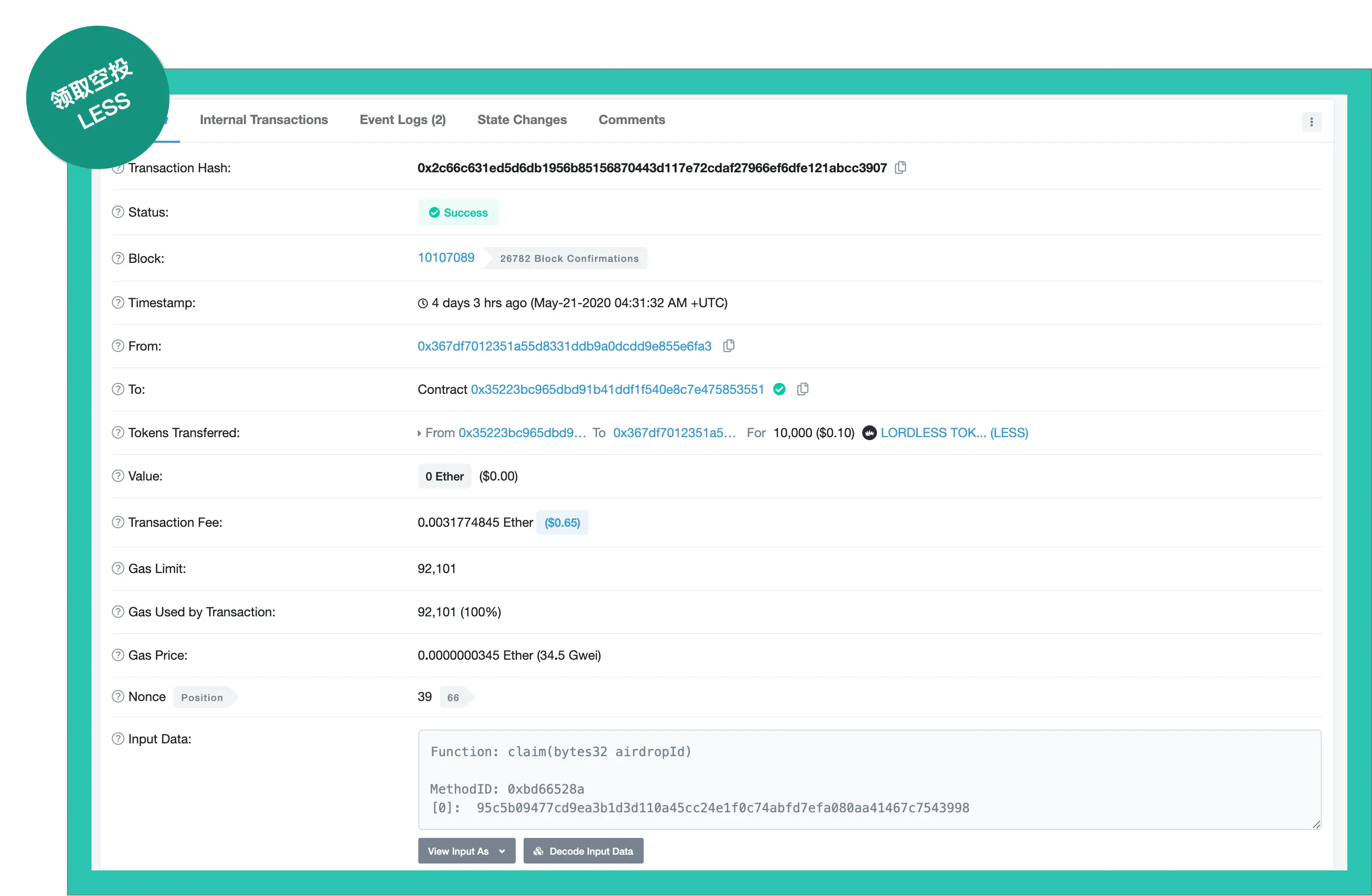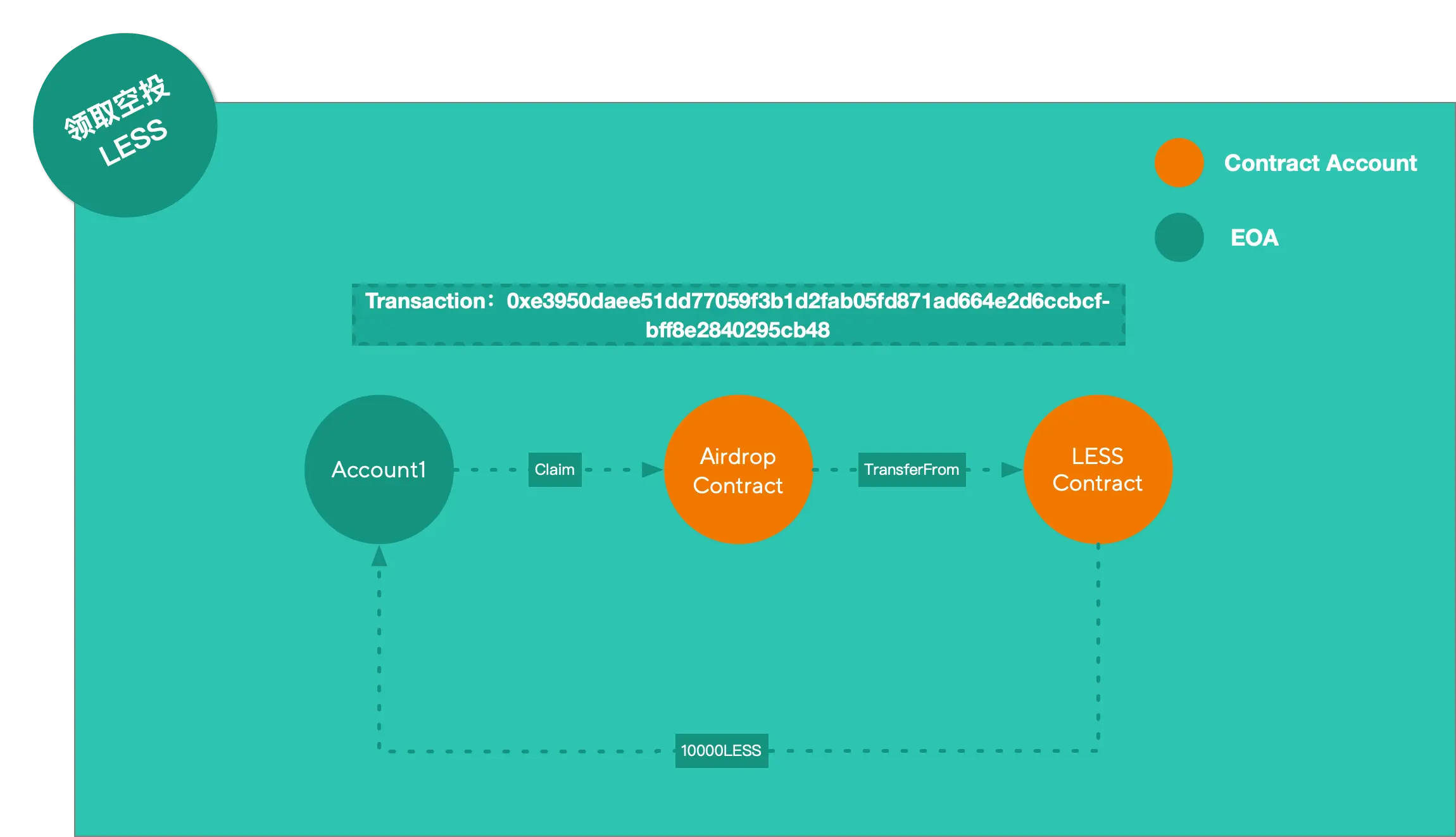 例如,下图表示通过向 空投合约(Airdrop Contract) 发送 Transaction 来领取 LESS Token: