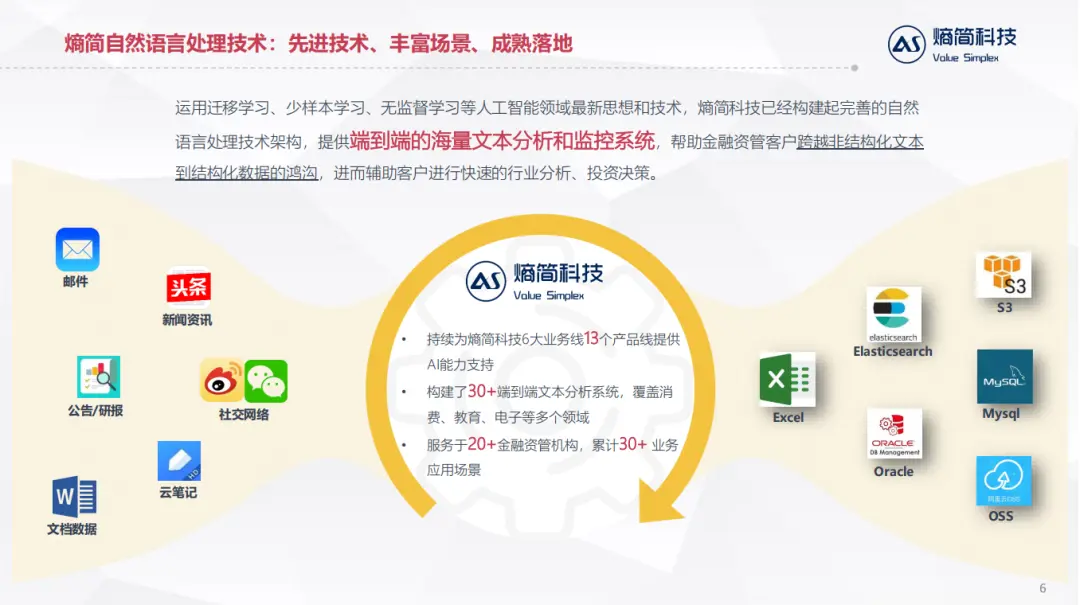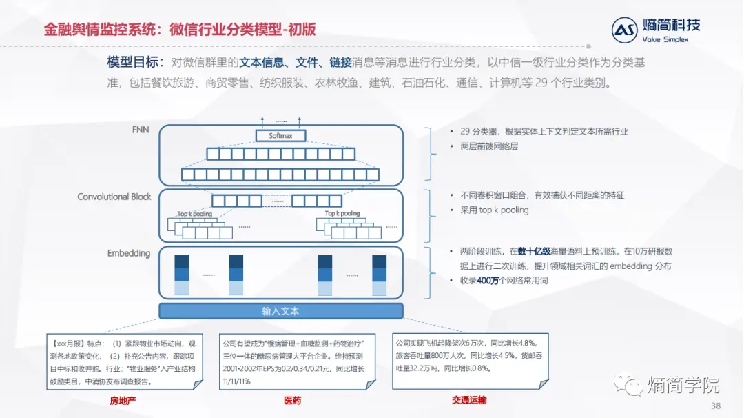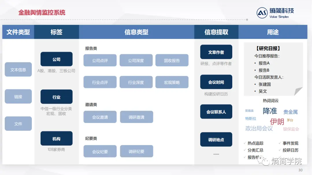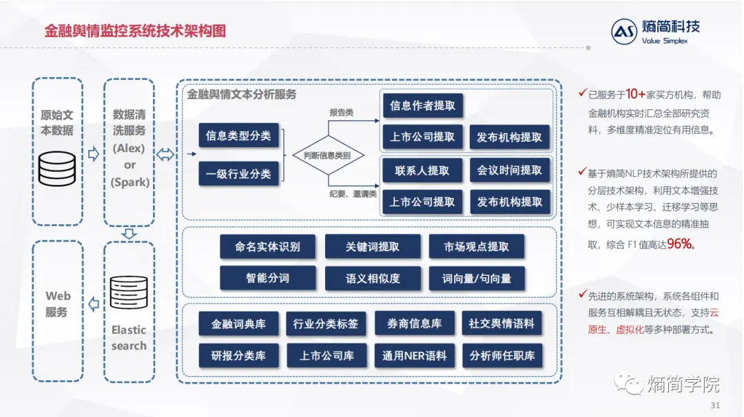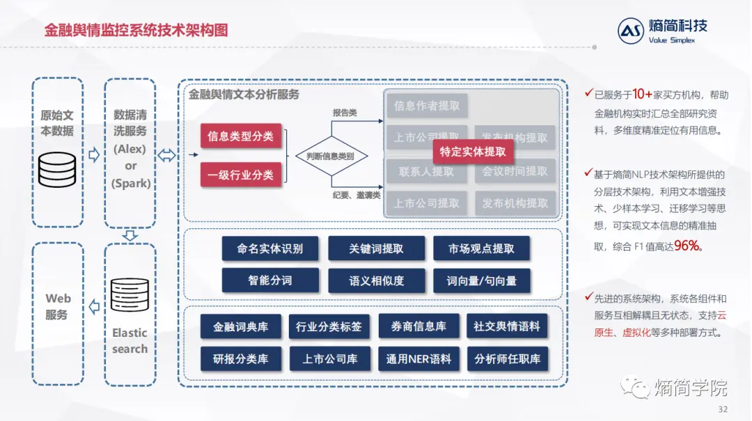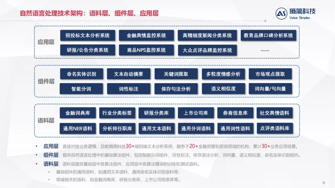 应用层:直接对接业务逻辑,目前熵简科技30+端到端文本分析系统,服务于20+金融资管和咨询领域的机构,累计30+业务应用场景。