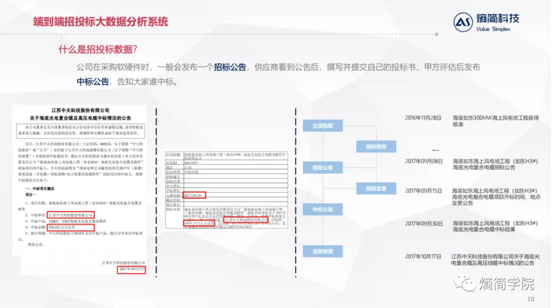 左边是一家公司披露的中标公告,中标金额6.5亿,公告的发布时间是17年的10月17日;中间是我们在互联网公开数据中采集到的中标公告,无论是项目名称、中标单位、中标金额,都和左边的内容是一致的,唯一不同的是时间,我们采集到数据的时间比公司披露的时间,早了16天,这就可以帮助我们在获得关键信息上占有优势。