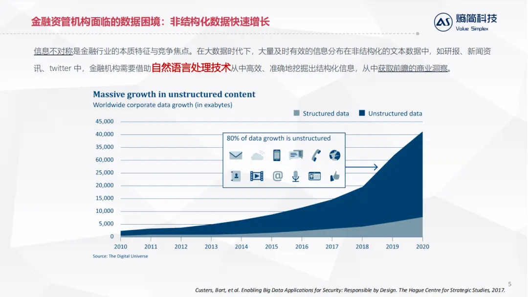 信息不对称是金融行业的本质特征与竞争焦点。如上图,是一张来自IDC的报告,表明最近几年全球新增的数据有80%来自非结构化数据。所以大量及时有效的信息分布在非结构化的文本数据中,如研报、新闻资讯、twitter 中,金融机构需要借助自然语言处理技术从中高效、准确地挖掘出结构化信息,从中获取前瞻的商业洞察。