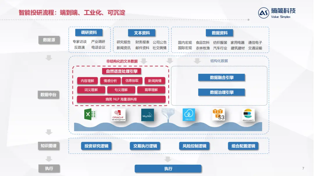 数据中台:这一阶段的核心任务是将原始数据转化为投资研究可以直接用的指标类数据。一方面,系统利用NLP技术,将非结构化的文本数据转化为结构化的数据。在此基础上,系统利用大数据、机器学习等技术,将NLP结构化之后的数据以及其他原本就是结构化的数据进行建模分析,进一步将数据淬炼为知识。