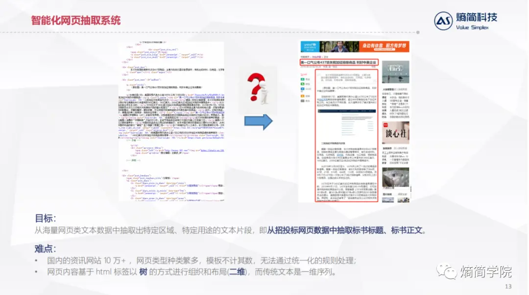 下面为大家介绍其中最核心的两个算法组件,智能网页抽取系统和招投标信息抽取模型。