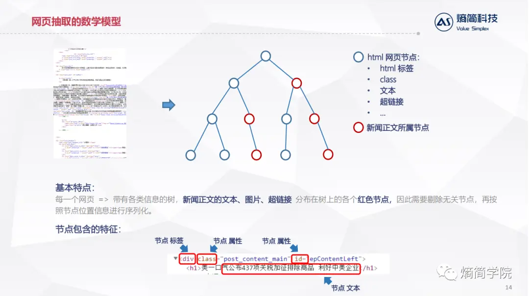 每一个网页可以等价成带有各类信息的树,新闻正文的文本、图片、超链接分布在树上的各个红色节点,因此需要剔除无关节点,再按照节点位置信息进行序列化,这里的难点是如何高精度的剔除无关节点。