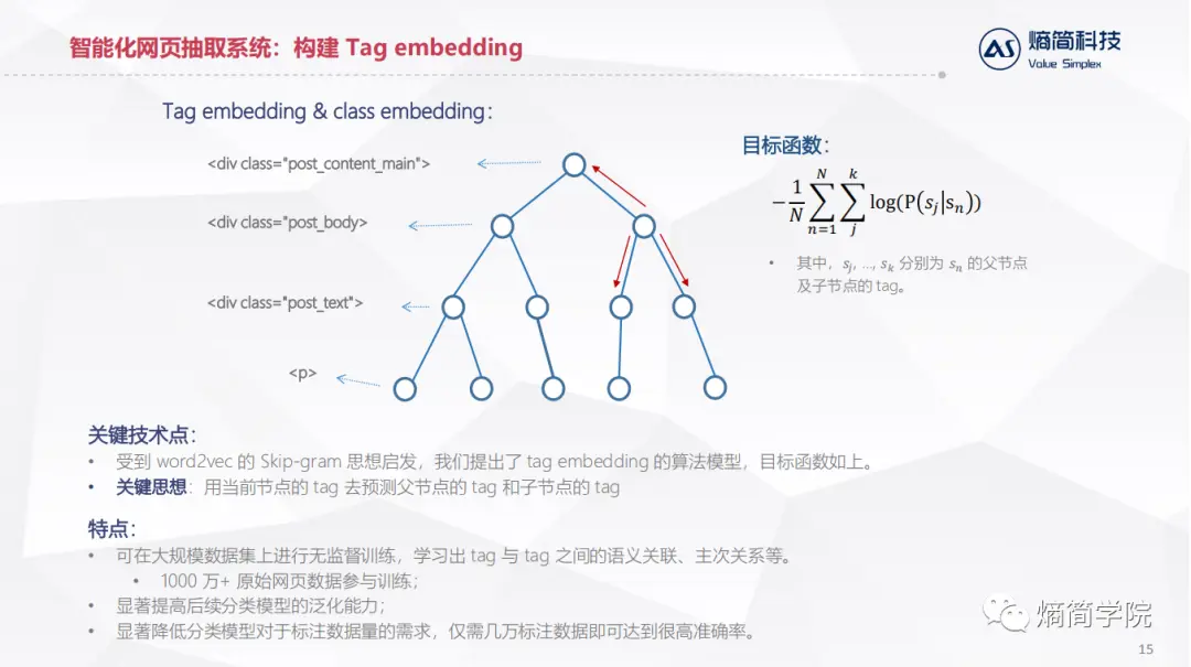 我们首先要解决的问题是把网页中的html编码的标签和属性进行数值化的表示。针对这个问题,受到 word2vec 的 Skip-gram 思想启发,我们提出了 tag embedding 的算法模型,目标函数如上。其关键思想是用当前节点的 tag 去预测父节点的 tag 和子节点的 tag。