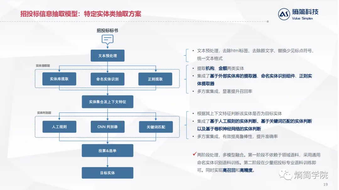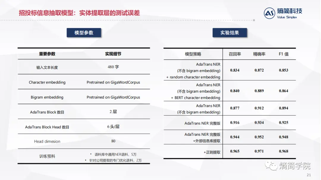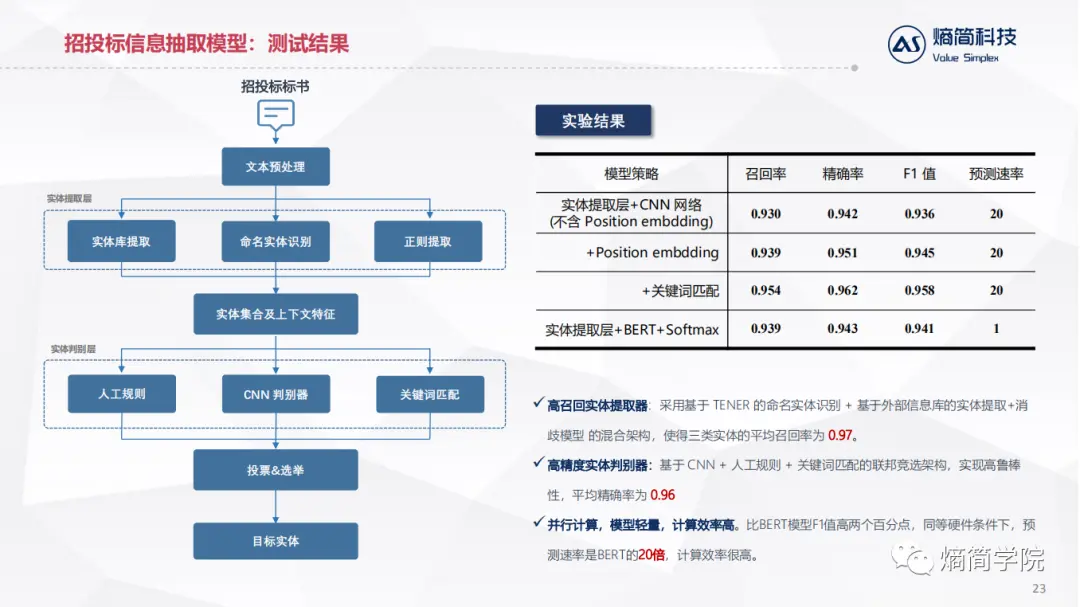 通过这种两阶段处理,多模型融合。第一阶段不依赖于领域语料,采用通用命名实体识别语料训练。第二阶段在少量招投标专业语料训练即可。同时实现了高召回和高精度。