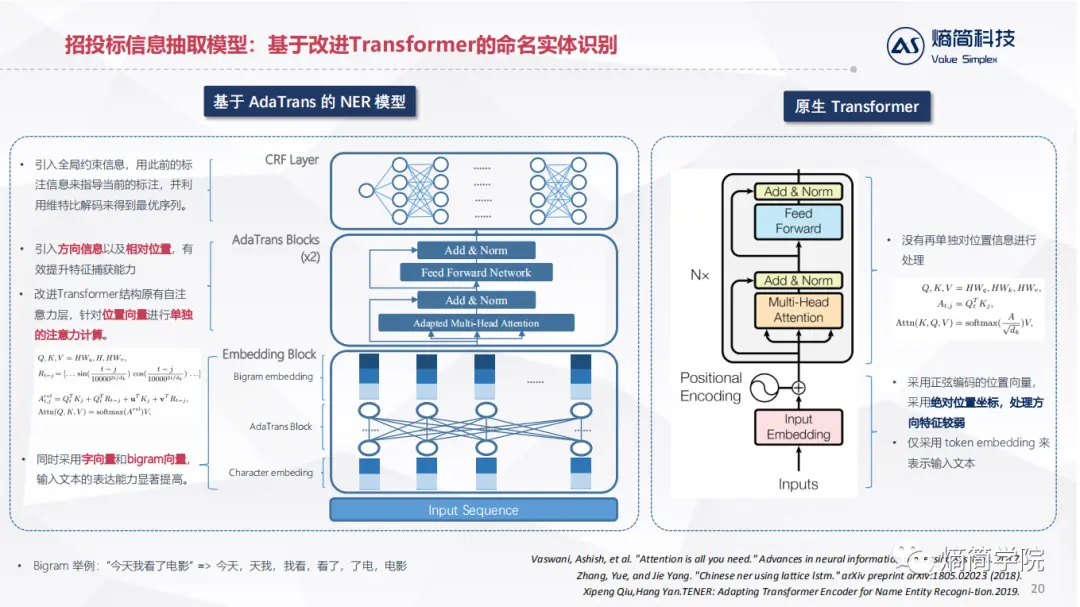 对于通用命名实体识别组件,我们团队先后迭代了几个版本,目前最新的方案参考了复旦大学邱老师团队在19年提出的模型。在这个模型中我们主要是以改进的Transformer模型为主要的特征提取器,再结合CRF层,引入全局约束信息来实现命名实体识别任务。左图为整个方案的结构图,右图为原生的Transformer结构,用来做对比。