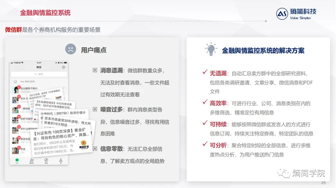 基于熵简NLP的层次化技术架构,我们构建了一种金融舆情监控系统,用于对卖方微信群消息进行多维度的信息提取和分析,可帮助金融资管客户实现从数据负债到数据资产的跨越,获取前瞻的商业洞察,赢得先机。