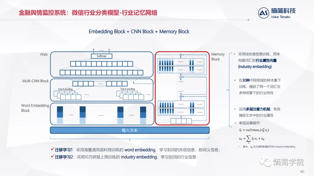 既然3阶段的训练方式是有效的,我们是不是可以把从外部研报学习到的知识用网络单独固化下来?基于这样的一种想法,我们提出了行业记忆网络结构,与TextCNN网络一起构成了混合模型。对于输入的文本,一方面会进行卷积运算和特征提取,另一方面会送入记忆网络中,这个网络首先对原始的文本用网络中学到的industry embedding进行编码,运用多层注意力机制,有效捕获文本中的行业属性,最终在30种不同领域的样本集下训练,捕获了同一个词汇在多种场景下的行业特性。
