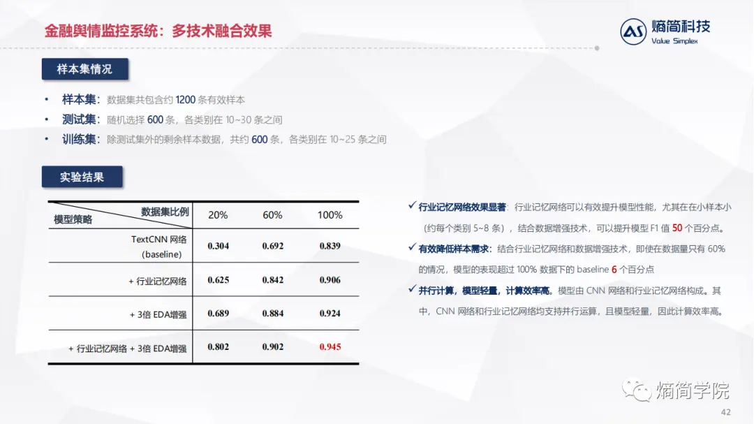 有效降低样本需求:结合行业记忆网络和数据增强技术,即使在数据量只有 60%的情况,模型的表现超过 100% 数据下的 baseline 6 个百分点