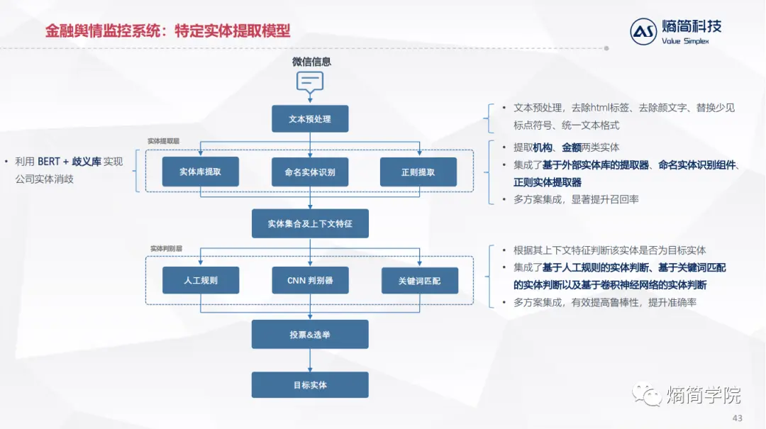 我们把这个任务抽象之后,跟命名实体识别非常类似,在我们的处理框架中,把它定义为特定实体类抽取,其结构包括:预处理层、实体提取层、实体判别层、选举决策层。这里重点介绍下实体提取层和实体判别层: