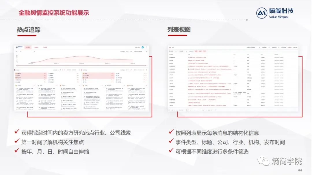 最后,简单展示一下金融舆情监控系统的一些功能,如热点追踪和列表视图。在热点追踪页面,用户可以第一时间获取机构的关注焦点,了解卖方的研究热点和公司线索。在列表视图页面,我们可以按照事件、公司、行业、消息类型等等,多维度的查看历史信息。
