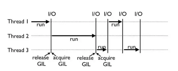 下面这张图,就是一个 GIL 在 Python 程序的工作示例。其中,Thread 1、2、3 轮流执行,每一个线程在开始执行时,都会锁住 GIL,以阻止别的线程执行;同样的,每一个线程执行完一段后,会释放 GIL,以允许别的线程开始利用资源。