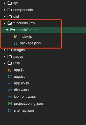 4,接着创建一个云函数,在云函数根目录右键,选择创建一个Node.js云函数,命名为"checkContent",开发者工具在本地创建出云函数目录和入口文件index.js,同时线上环境创建出对应的云函数