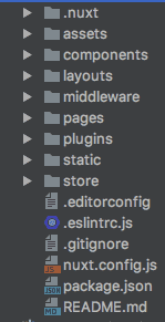 - store: 目录用于组织应用的 Vuex 状态树 文件。 Nuxt.js 框架集成了 Vuex 状态树 的相关功能配置,在 store 目录下创建一个 index.js 文件可激活这些配置。