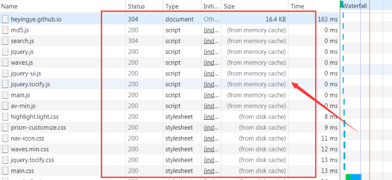 图片中请求对应的size值为该缓存,分别为from memory cache 和 from disk cache。