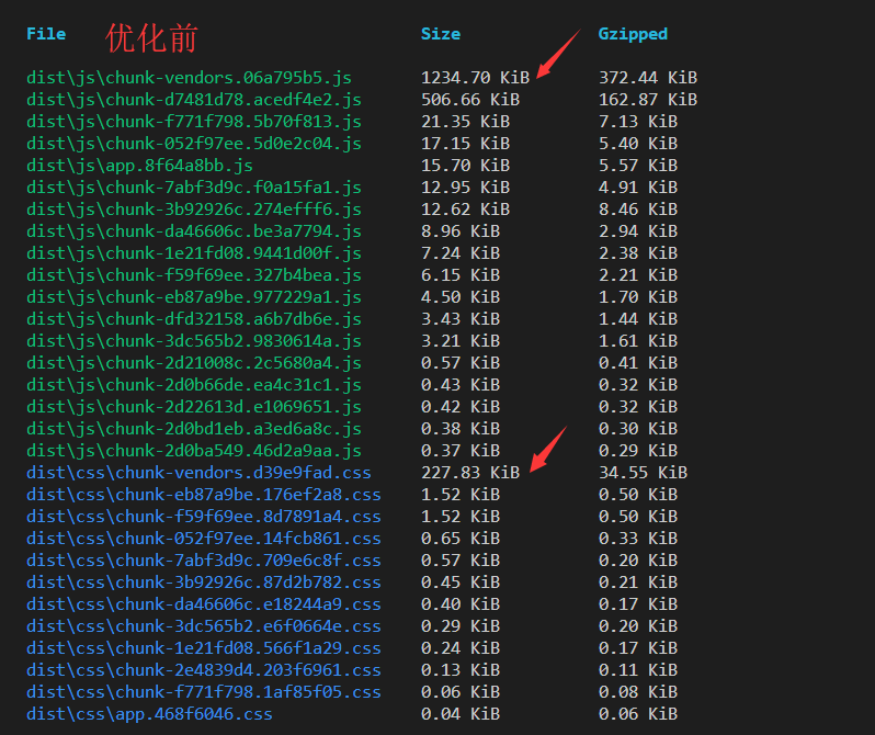 module.exports = { chainWebpack: config => { config.resolve.alias .set("@", resolve("src")) .set("assets", resolve("src/assets")) .set("components", resolve("src/components")) .set("public", resolve("public")) .set("common", resolve("src/common")) .set("network", resolve("src/network")) .set("views", resolve("src/views")) .set("router", resolve("src/router")) .set("store", resolve("src/store")) .set("mock", resolve("src/mock")) .set("tests", resolve("tests")) .end() .end() .plugin('HtmlWebpackExternalsPlugin') .use(require('html-webpack-externals-plugin'), [{ externals:[{ module: 'vue', entry: 'https://cdnjs.cloudflare.com/ajax/libs/vue/2.6.11/vue.min.js', global: 'Vue' },{ module: 'element-ui', entry:'https://cdnjs.cloudflare.com/ajax/libs/element-ui/2.13.2/index.js', }] }]) }}通过提取常用的库如vue, elementui使得打包vender文件体积大幅减小。这里css没有缩小,是由于只提取了element-ui的js文件,它仍然有css文件要引入。