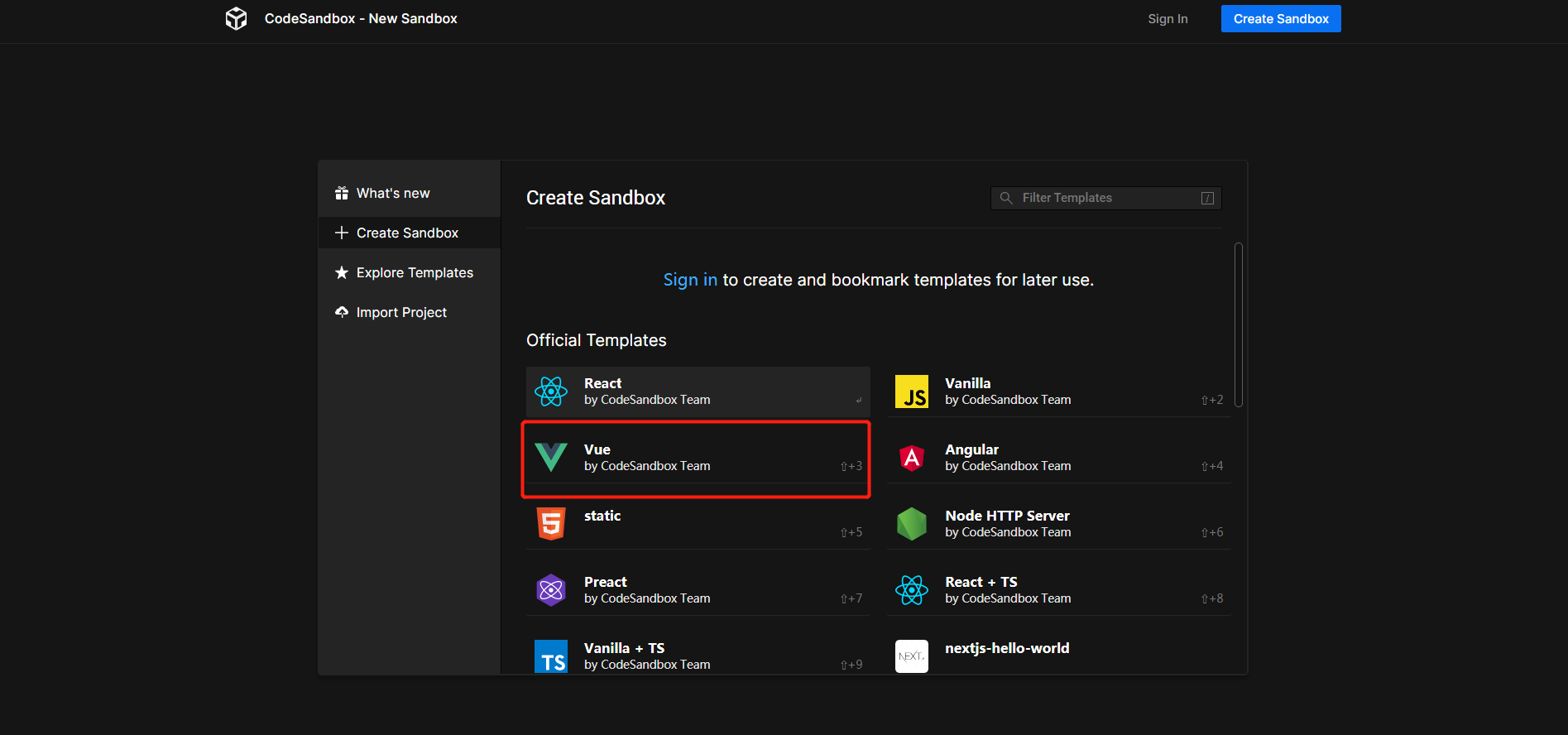 - 打开网站:codesandbox.io/ (注意:不需要登陆)