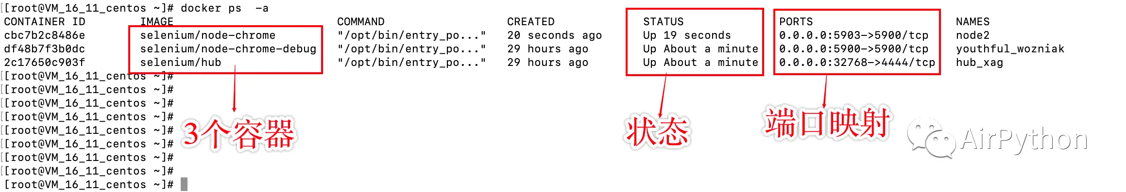 # chrome-debug容器docker run -d -p 5900:5900 --link hub_xag:hub selenium/node-chrome-debug使用 docker ps -a 命令即可以查看容器的运行状态及端口映射情况