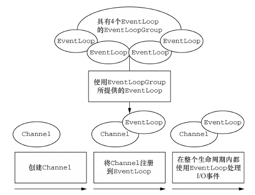EventLoop,这是Netty处理事件的核心机制。上面我使用了EventLoopGroup。我们在NIO中通常要做的几件事情,如注册感兴趣的事件、调度相应的Handler等,都是EventLoop负责。Channel、EventLoop、Thread以及EventLoopGroup 之间的关系可以用如下图表示: