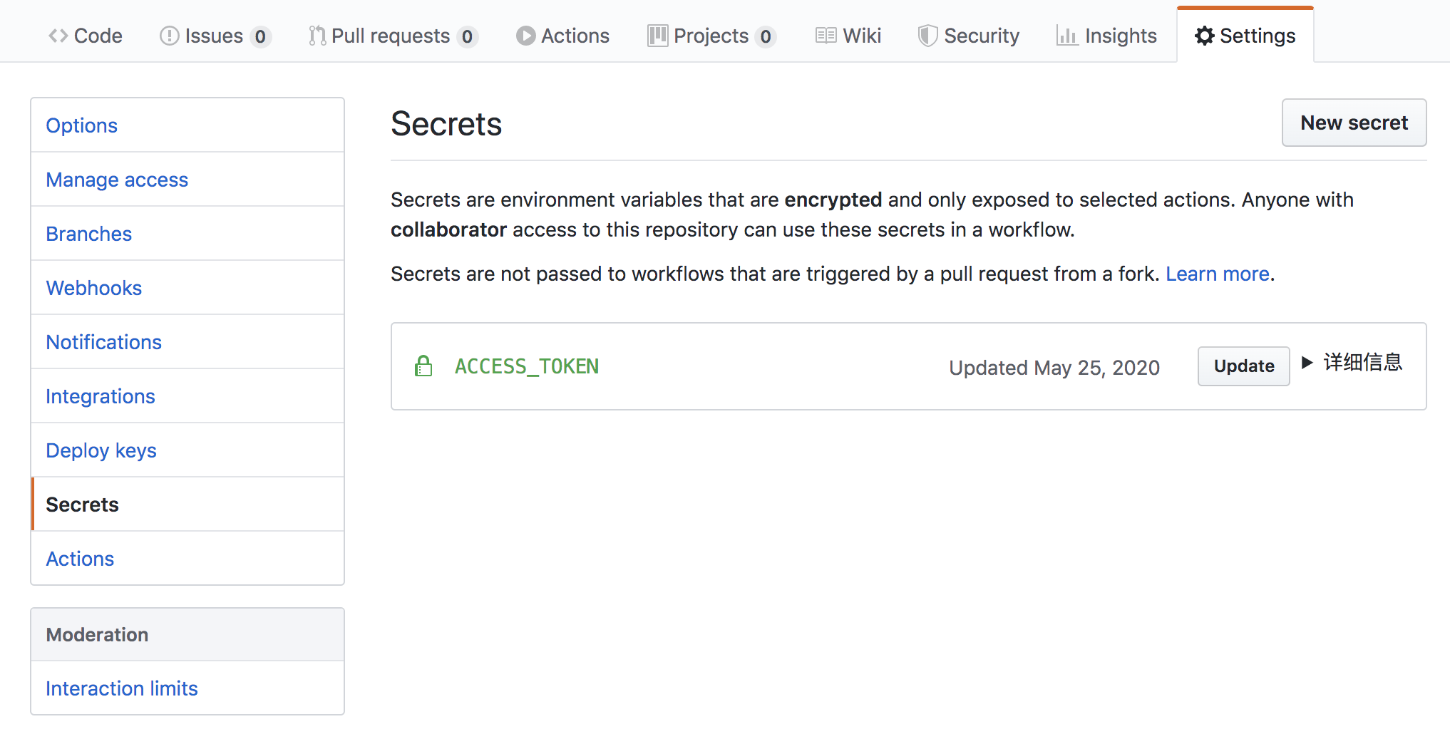 Personal access tokens并配置到当前仓库的Settings>Secrets下面