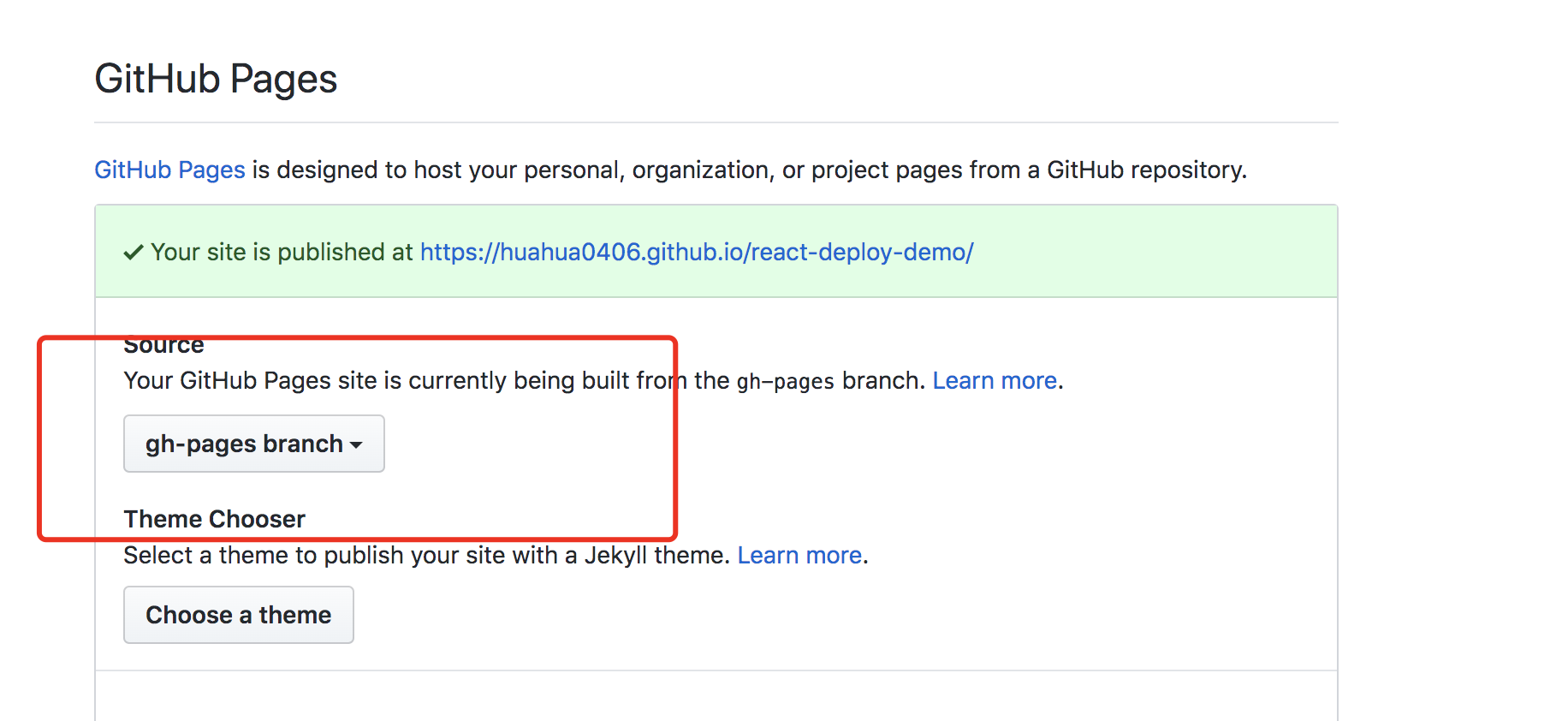 打开Github Pages链接就可以看到效果了,我的预览地址是 huahua0406.github.io/react-deplo… 这个,可以看到已经生效了