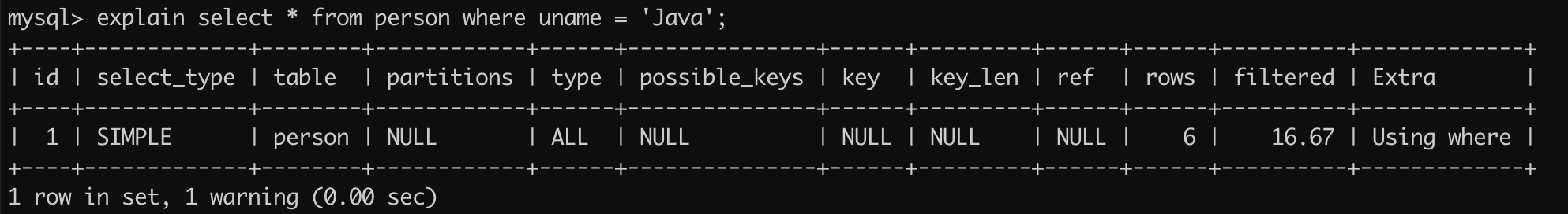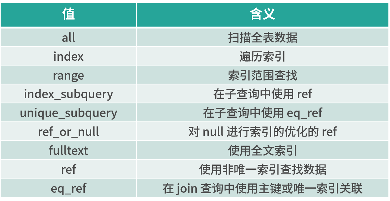 当 type 为 all 时,则表示全表扫描,因此效率会比较低,此时需要查看一下为什么会造成此种原因,是没有创建索引还是索引创建的有问题?以此来优化整个 MySQL 运行的速度。