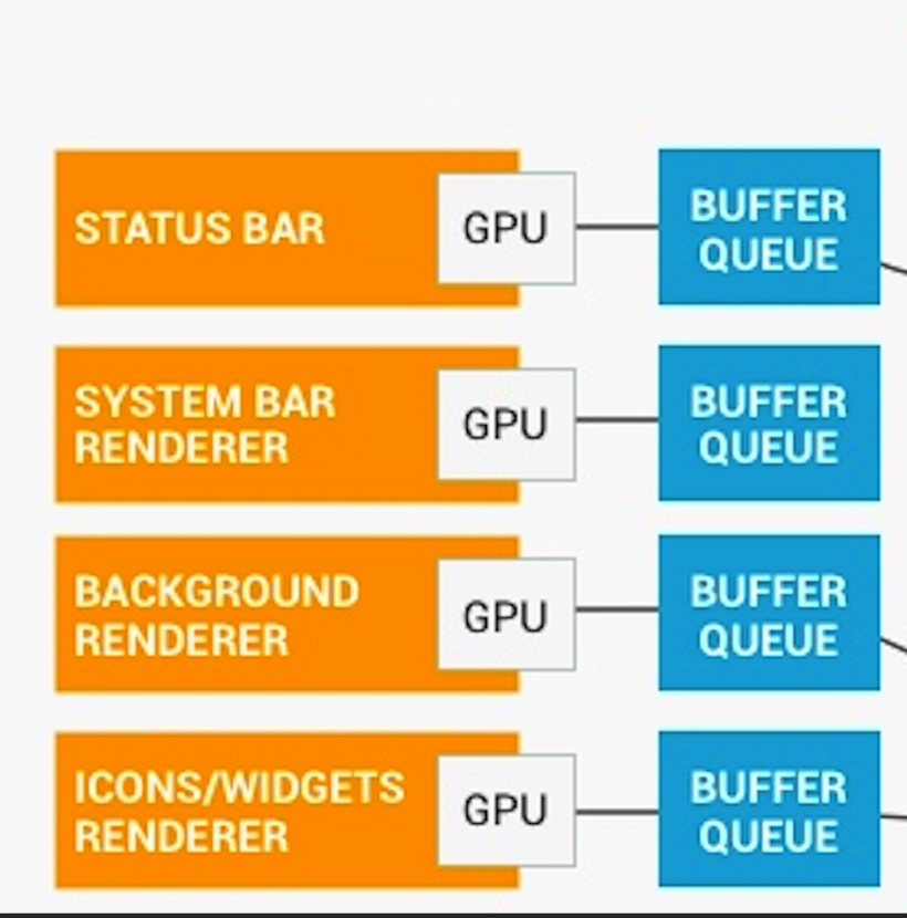 - 将应用内容渲染到暂存缓冲区中,然后在其上渲染状态栏,再在其上渲染导航栏,最后将暂存缓冲区传送到显示硬件。