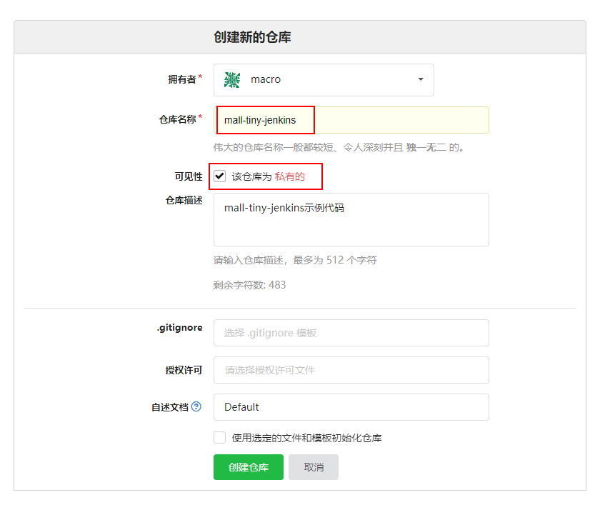 - 直接使用我的仓库右侧的加号即可创建仓库,简单设置下仓库名称和可见性来完成创建;
