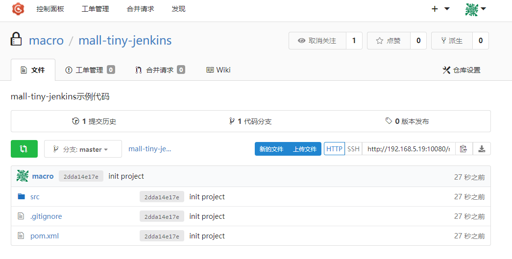 - 检出完成后,加入我们的代码直接提交、推送,在Gogs里面就可以看到我们提交的代码了。