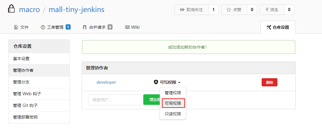 增加新的协作者并设置好权限即可,这样协作者就可以访问并向该仓库提交代码了。