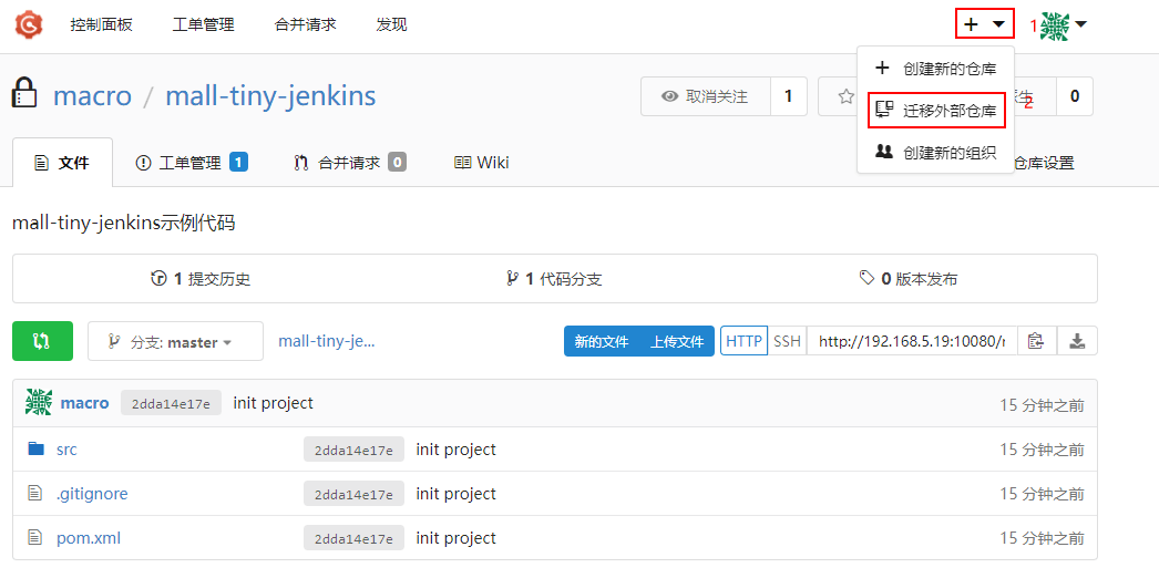 - Gogs还提供了从外部仓库迁移代码的功能,通过头像左侧的加号,然后选择