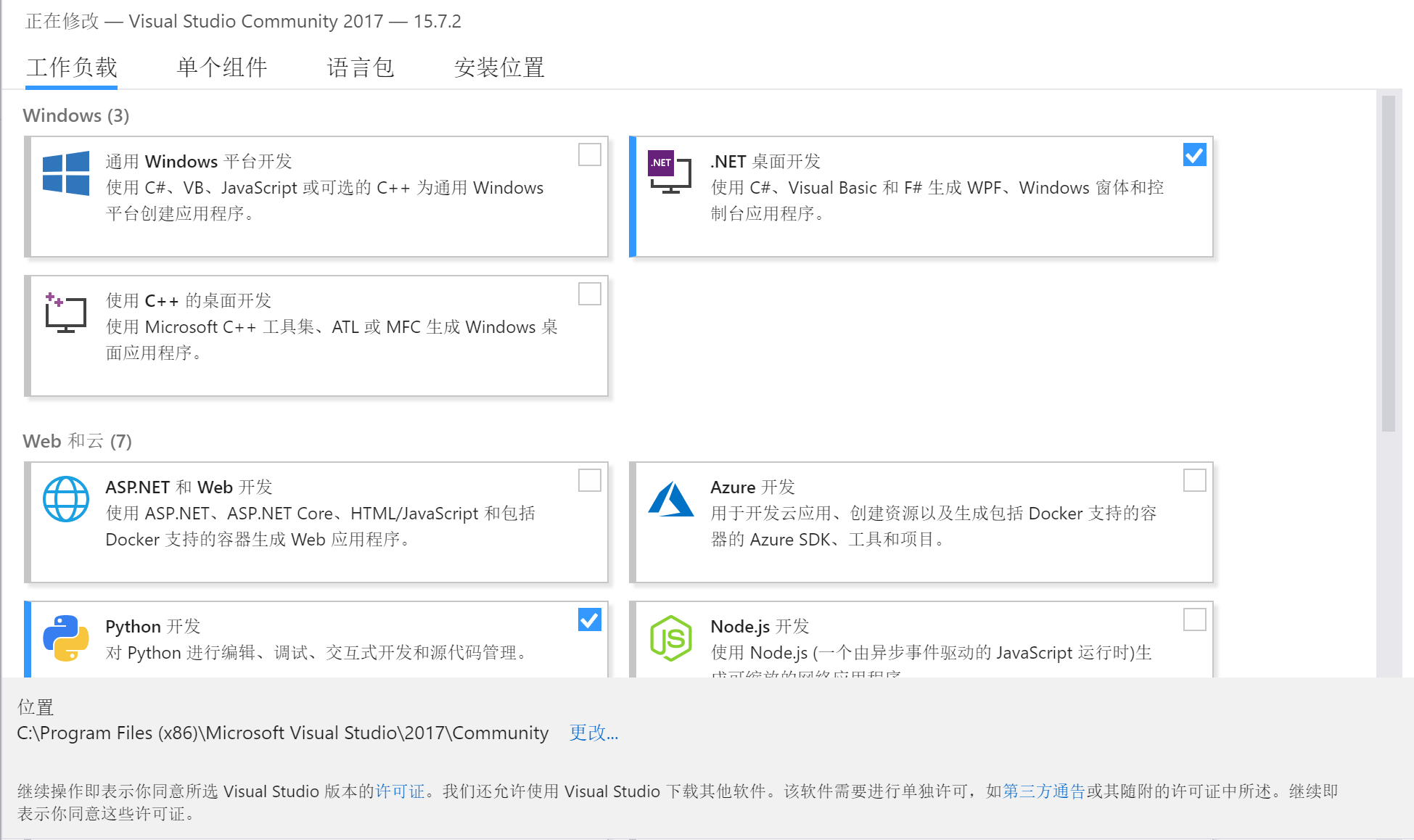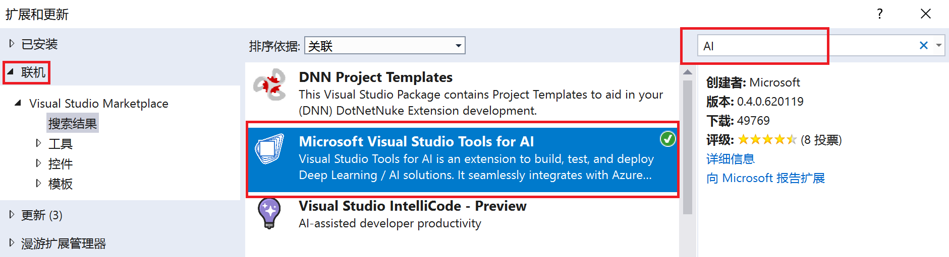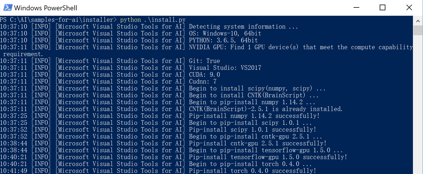 AI应用开发实战系列之一: 从零开始配置环境 纯洁的代码 2020-05-27 170 阅读7分钟 AI应用开发实战 - 从零开始配置环境与本篇配套的视频教程请访问:www.bilibili.com/video/av244…零、前提条件一台能联网的电脑,使用win10 64位操作系统请确保鼠标、键盘、显示器都是好的一、Windows下开发环境搭建本教材主要参考了如下资源:官方github教程:github.com/microsoft/v…斗鱼tv教程:v.douyu.com/show/V6Aw87…本教程分为五步: - 安装VS:难度一星 - 安装python:难度一星 - 安装CUDA和cuDNN:这是本教程最繁琐的一步,这一步直接拉高本教程的平均难度。 - 配置机器学习环境:这是本教程最简单的一步,为了方便用户配置环境,微软提供了一键安装工具!没错,一键安装工具!业界良心阿! - 安装VS Tools For AI插件:难度一星note:本教程对各个软件需要使用的版本都做出了明确说明,请安装指定的版本请放轻松,接下来的傻瓜教程不需要动脑子,你甚至可以打开手机边刷微博边配置环境0.安装Git访问 git-scm.com/download/wi…选择64-bit Git for Windows Setup下载双击.exe开始安装选择好自己的安装路径,一路next,直到Adjusting your PATH environment请选择Use Git from the Windows Command Prompt这一步就已经将Git添加到环境变量中了,然后就可以直接在命令行里使用Git啦。然后继续next,直到安装结束1.安装VS访问 www.visualstudio.com/zh-hans/pro… 在产品中点击Visual Studio 2017选择Community版本下载打开Visual Studio Installer进行如下的配置:仅选择.NET桌面开发与Python开发即可仅选择.NET桌面开发与Python开发即可仅选择.NET桌面开发与Python开发即可note:请自行决定Visual Studio的安装路径等待数分钟,时长视网络状况而定,这个时候你可以去泡一杯茶,或者听一首歌,如果你的网络不是很好,那你可以去看集美剧或者别的什么,等待安装结束。note:坐 和 放宽2.安装python访问 www.python.org/downloads/选择版本3.5.4或3.6.5 ,Windows x86-64 executable installer下载。 打开安装包,在安装前,请选择Add Python 3.X to PATH,随后按照默认选项安装即可。点选后,程序将自动将Python加入环境变量,这样避免在安装后手动配置环境变量。 安装结束后,请进行如下操作验证python是否安装成功1.同时按下 win 与 R,在弹出的输入框里输入cmd2.在弹出的窗口中输入 python 3.输入exit()退出4.输入python -m pip install -U pip以更新pip到最新版本1234note: pip是一个用来管理python包的工具自此,你已经完成了python的安装,在朝着AI技术大牛的路上又前进了一步!note:请伸出大拇指给自己一个赞��3.安装CUDA与cuDNN如果你的电脑装有Nvidia的显卡,请进行这一步配置,否则请跳过。首先通过操作系统更新,升级显卡驱动到最新版。3.1 安装CUDA打开 developer.nvidia.com/cuda-toolki…选择CUDA 9.0 进行安装。点击后,选择如下的配置:note:请选择local版本下载,一旦失败还可以重新再来;如果使用network版本,一旦失败,需要重新下载1.4GB的安装包打开安装包,进行安装,请自行配置CUDA的安装路径,并手动将CUDA库添加至PATH环境变量中。note:在Windows中,CUDA的默认安装路径是:“C:\Program Files\NVIDIA GPU Computing Toolkit\CUDA\v9.0\bin”3.2 安装cuDNNnote:打起精神!这是操作最复杂的一步!访问 developer.nvidia.com/rdp/cudnn-a… 找到我们需要的cuDNN版本:cuDNN v7.0.5 (Dec 5, 2017), for CUDA 9.0cuDNN v7.0.5 Library for Windows 10点击链接,等待着你的并不是文件下载,而是:↑这就是本教程里最麻烦的一步:在下载cuDNN之前需要注册Nvidia会员并验证邮箱。不过还好可以微信登录,省掉一些步骤。一番令人窒息的操作之后,我们终于得到了cuDNN,我们把文件解压,取出这个路径的cudnn64_7.dll,复制到CUDA的bin目录下即可。默认的地址是:C:\Program Files\NVIDIA GPU Computing Toolkit\CUDA\v9.0\binnote:到这里,我们已经完成了本教程最复杂的一步了4.安装机器学习的软件及依赖这一步虽然是整个教程最简单的一步,甚至比把大象关进冰箱更简单。你只需要:win + R ,打开cmd,在命令行中输入:cd c:\ //选择一个你喜欢的路径md AI //在这里创建一个AI目录cd AI //打开这个目录//克隆仓库到本地git clone github.com/Microsoft/s…cd samples-for-ai //打开这个目录cd installer //还有这个目录python.exe install.py //开始安装然后刷会微博,等待安装结束即可。成功之后是这样的:或者你觉得自己不怕麻烦,那么请访问:github.com/Microsoft/v…根据教程按步安装,相信我,你会回来选择一键安装的。note:就差一步啦!成功就在眼前!5.安装tools for ai插件打开Visual Studio,选择工具->扩展和更新->选择“联机”->搜索“AI” 就像这样:等待下载完成之后,关闭Visual Studio,没错,关闭Visual Studio,系统将自动安装AI插件。安装完毕后再次打开Visual Studio,你将在界面上看到这样的内容:那么恭喜你!安装成功!note:千里之行始于足下,恭喜你成功地完成了环境的搭建,接下来就已经可以使用Visual Studio Tools For AI进行开发了��二、离线模型的训练6.14日更新 GitHub上的samples-for-ai进行了一定的更新,目前MNIST文件夹下只有一个mnist.py文件,下述步骤中,请使用最新的mnist.py文件在进行完环境搭建后,我们马上就可以开始训练第一个模型了,我们选择tensorflow下的MNIST作为第一个例子。MNIST的介绍请参考这个链接 www.tensorflow.org/versions/r1…首先我们打开这个路径:C:\AI\samples-for-ai\examples\tensorflow,如果你在别的目录下克隆了目录,那么请打开你对应的目录。然后双击TensorflowExamples.sln 就像这样:note:如果存在多个Python环