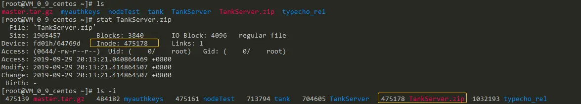 如下图,可以通过 stat 命令打印出一个文件(以 TankServer.zip为例)的 inode 所有元信息,还有 inode 号。