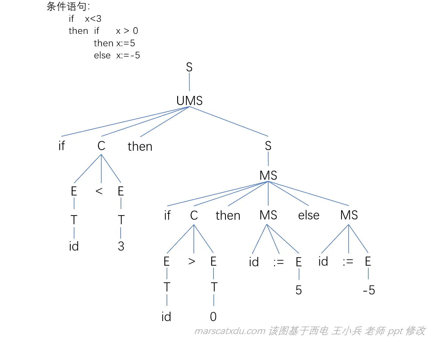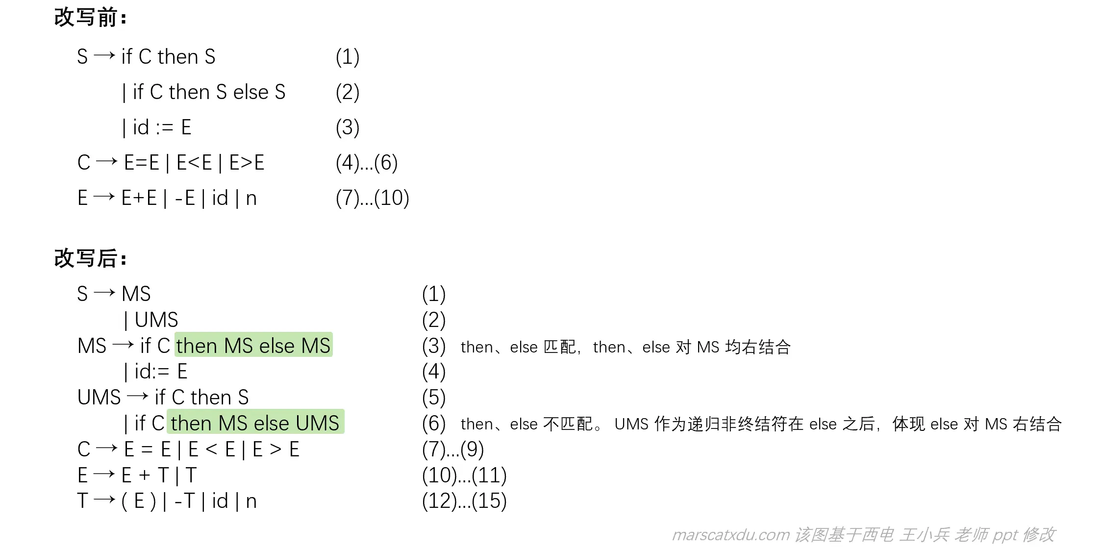 为改写此文法,可以将 S 分为完全匹配(MS)和不完全匹配(UMS)两类。在 MS 中体现 then、else 个数相等即匹配且右结合;在UMS 中 then、else 不匹配,体现 else 右结合。
