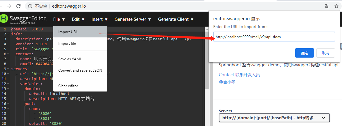 正确做法是通过swagger在线编辑器导入swagger文档,点击File选择import URL输入本地swagger url,导入成功点击Edit看见Cover to OpenAPI3,转化成openapi3后。