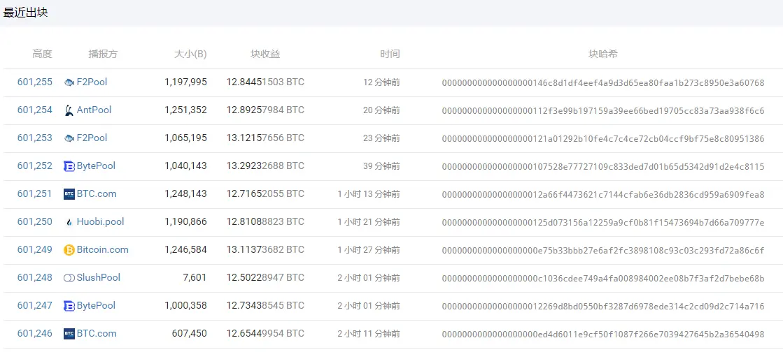 我们将引入一个约束条件和一个叫nonce的随机数的新字段。这个约束条件就是块哈希开头部分的零 (前导零) 的个数,随机数会不断变化,直到我们获得满足约束条件的哈希值。前导零的数量决定了工作量证明算法的难度。看看下面比特币出块图就知道了,比特币的难度的不断增加是通过增加前导零的数量实现的。