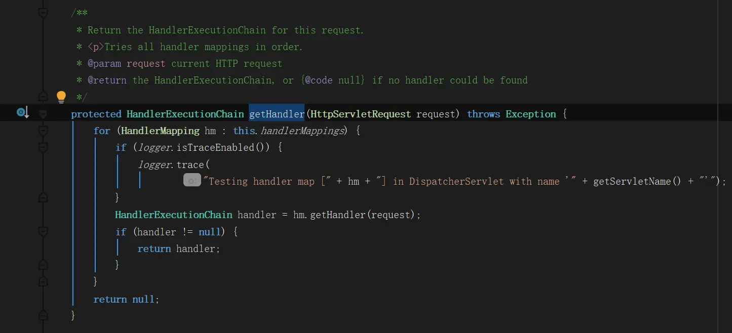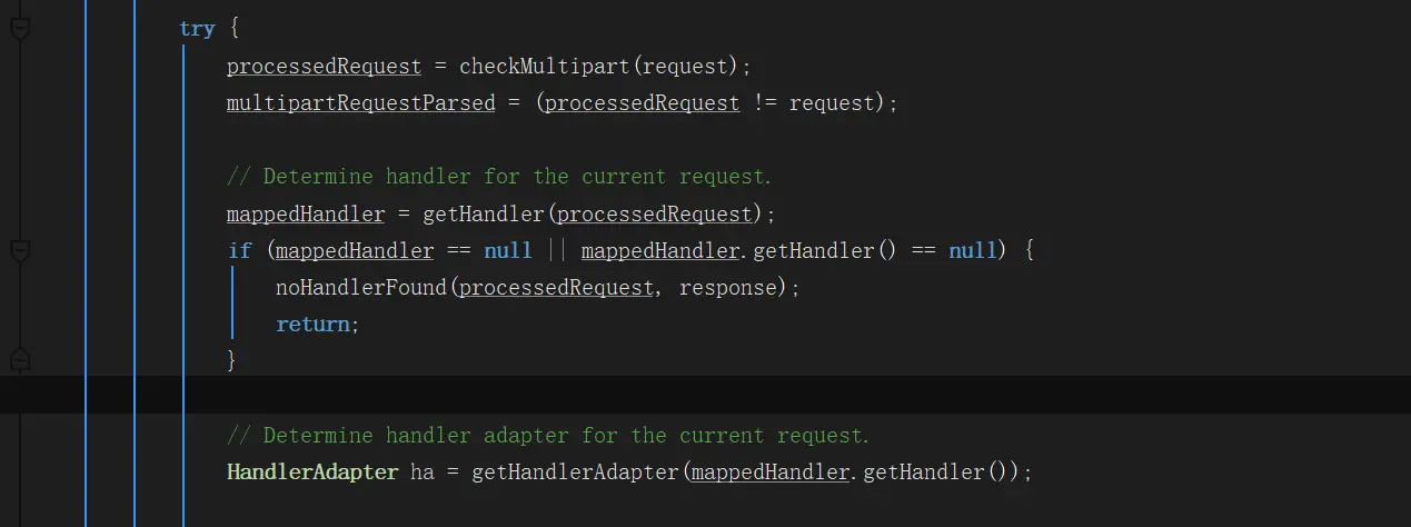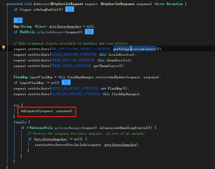 所以,我们可以找到DispatchServlet的doService方法,可以发现,doService()方法中最主要的代码就是doDispatch(HttpServletRequest request, HttpServletResponse response)方法。这个方法是分发请求的核心所在。