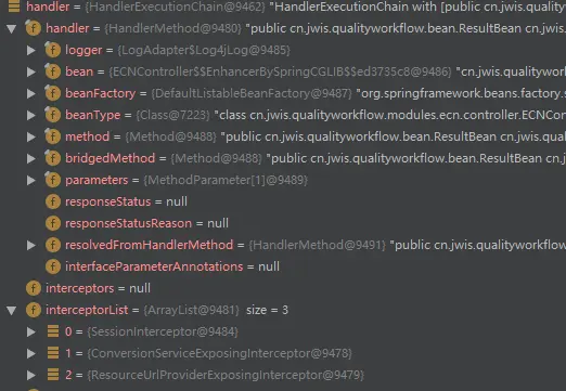 另外需要注意的是,假如你自定义了n个拦截器,会发现HandlerExecutionChain会有n+2个拦截器,ConversionServiceExposingInterceptor和ResourceUrlProviderExposingInterceptor都属于默认的拦截器。ConversionServiceExposingInterceptor用于类型转换,ResourceUrlProviderExposingInterceptor用于提供资源的URL.而SessionInterceptor属于自定义的拦截器。