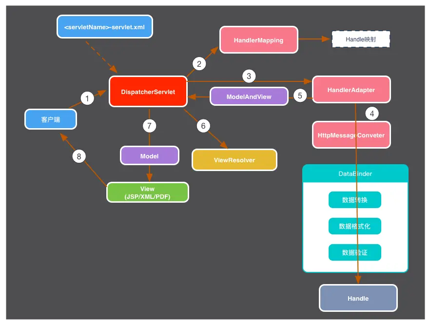 上面的图,只需要看步骤1和步骤2和步骤3. hello.action的请求后缀为action,根据servlet-mapping的url-pattern映射到名为springmvc的DispatchServlet上,大体就是这么个流程。现在的Spring Boot默认配置 只有一个 DispatchServlet,对于静态资源后缀的请求,需要自己做额外的配置,可以参考这篇文章.