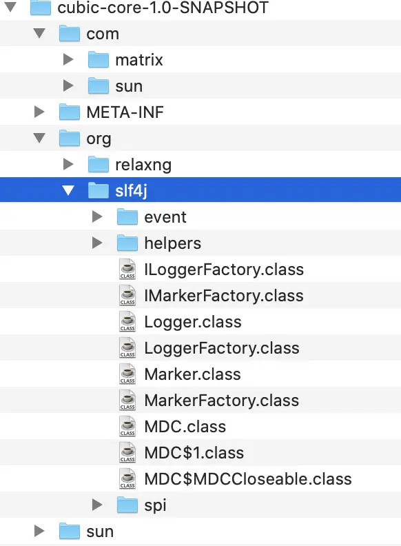 这里的打包其实是把我们的依赖都打进去了,来看个jar 解压后的截图,比如我们依赖了slf4j,如图: