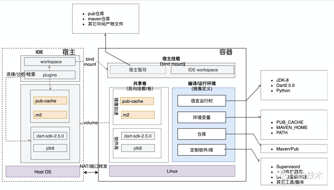 宿主通过Volume共享容器内的文件(如pub仓库、maven仓库),提升编译速度