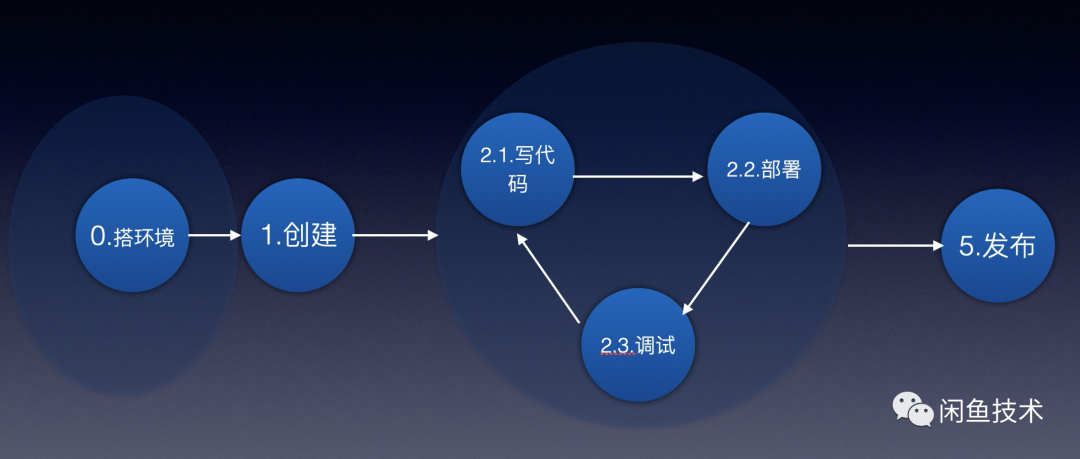 下图是简化后的闲鱼FaaS开发视角下的开发生命周期,和传统服务端开发相同,图中2.1~2.3是最高频动作,将这些动作串联起来、提供标准的操作语义,以高效的运转对于提升FaaS开发生产力至关重要。闲鱼FaaS希望给用户提供像开发本地函数一样开发FaaS代码的体验。