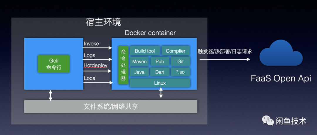 为了解决上面两个核心问题,如下图所述,GCli将研发闭环拆解成适合Serverless研发风俗的开发指令;为了让用户继承其研发习惯和工具,闲鱼优先选择了基于本地的开发方案;使用Docker技术统一开发环境,在Dcoker内声明Dart FaaS技术栈依赖的运行环境(软件+配置)。