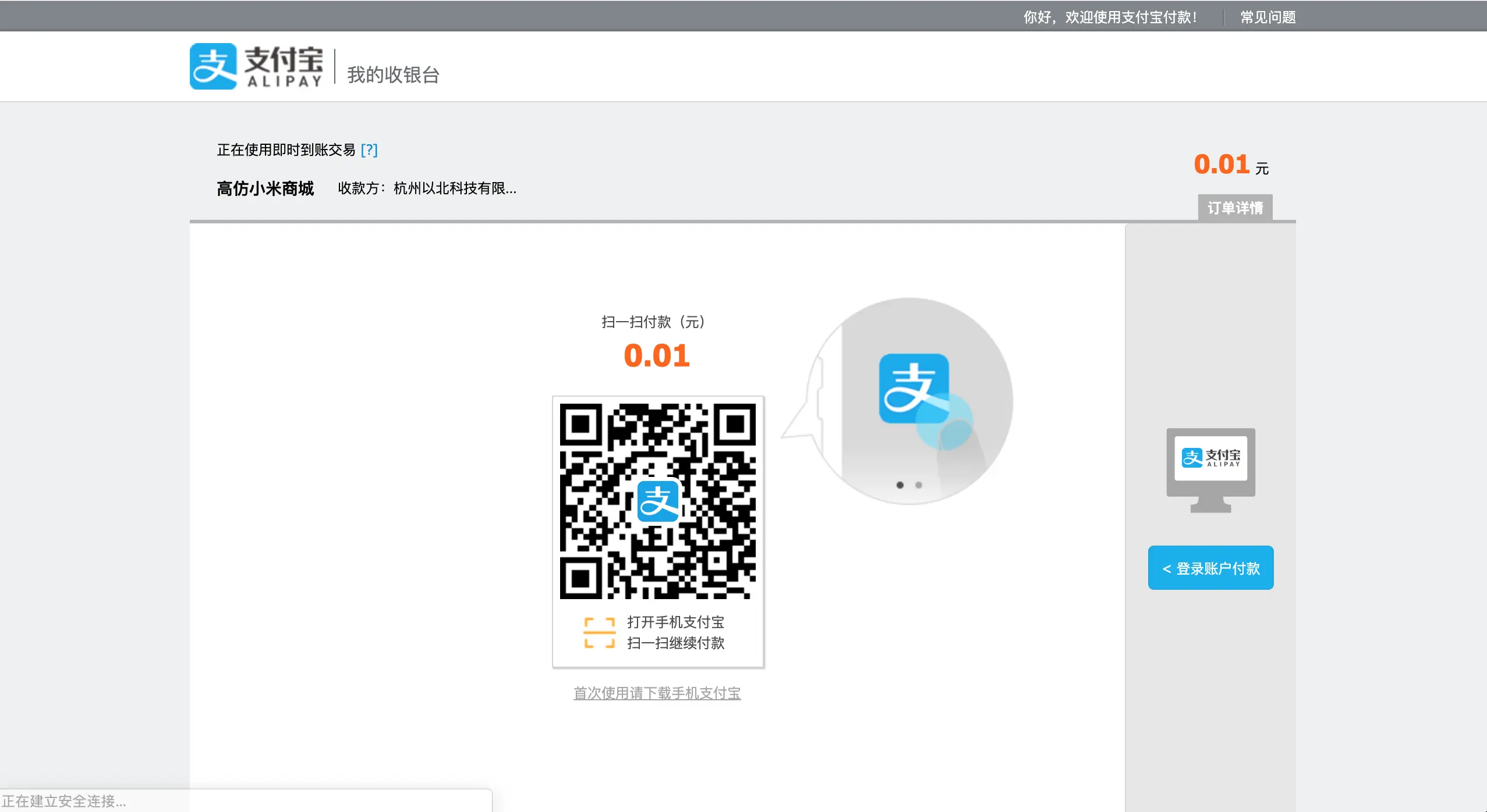订单结算交互实现,同时包含微信支付和支付宝支付同后台对接。