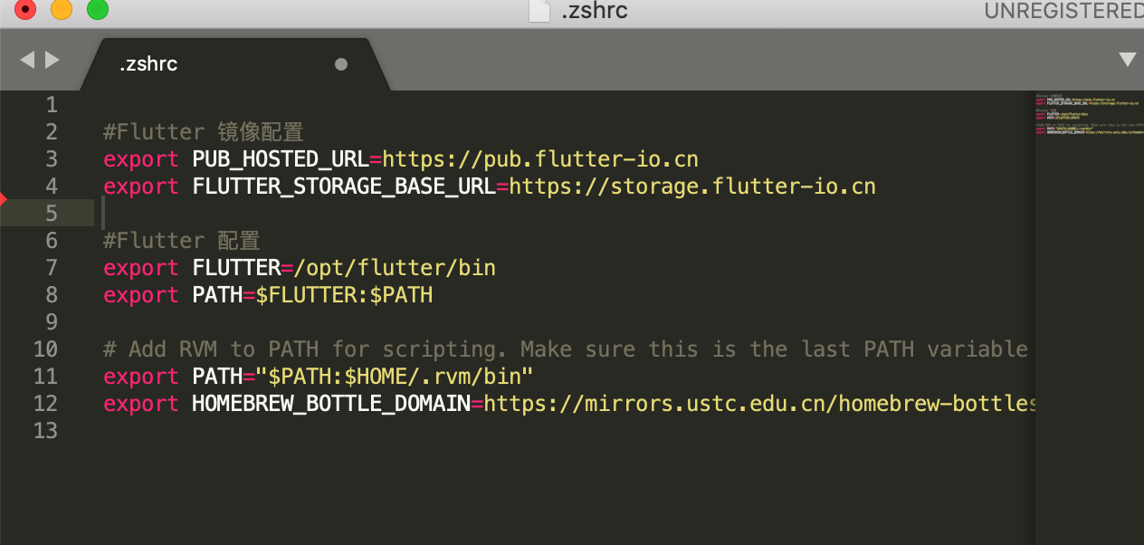 $ export PATH=$FLUTTER:$PATH备注:这里特别说明一下这里的配置不是在终端直接输入命令,而是打开Shell文件在里面进行编辑,自己跳过的坑,希望对读者有帮助