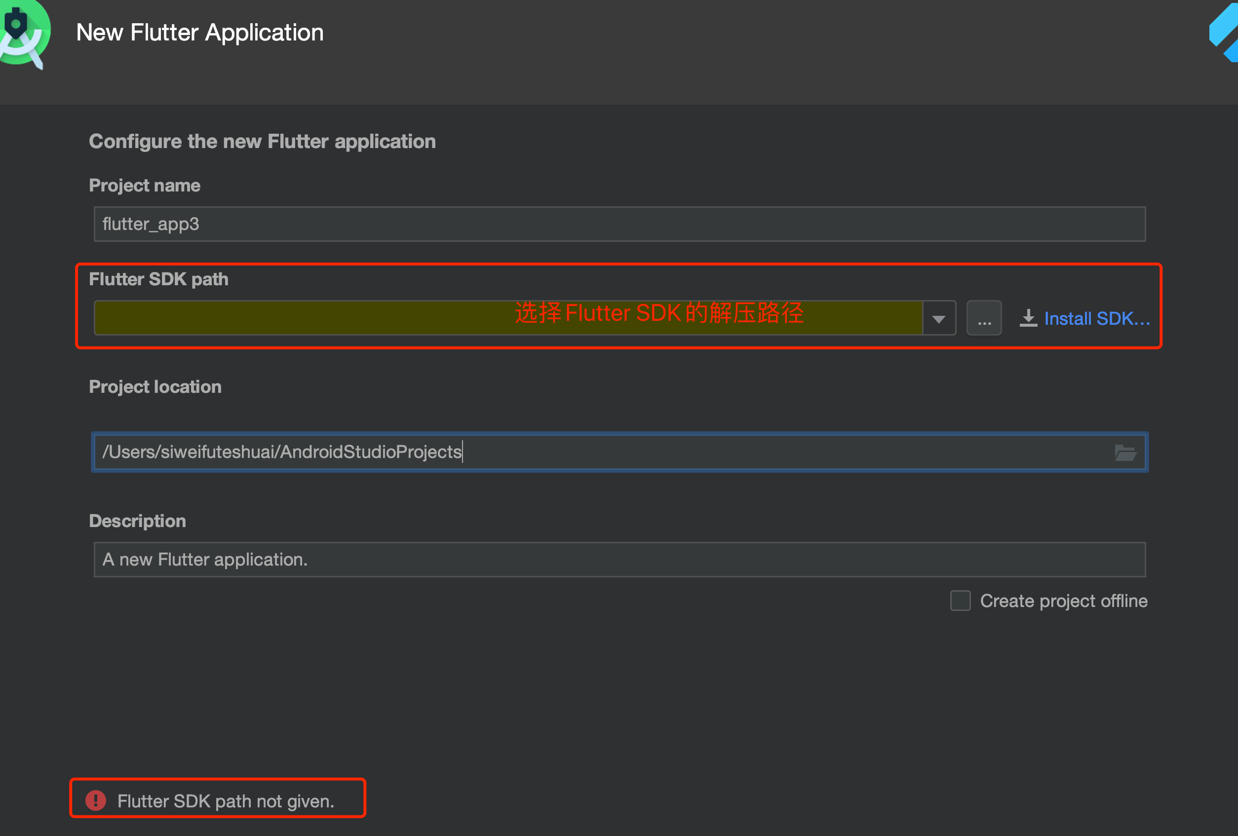 创建Flutter项目 提示 Flutter SDK path not given