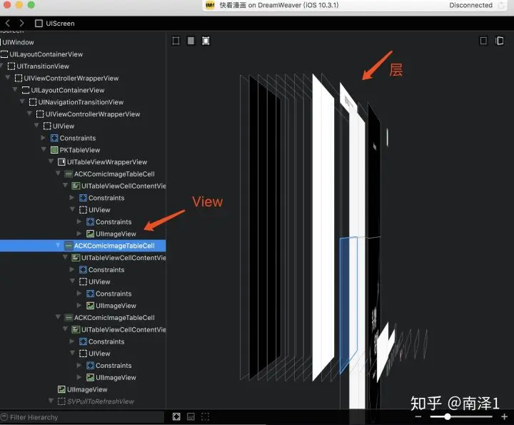 这里可以看到,上面有一个弹窗遮住了后面的漫画内容,如果能去掉弹窗,岂不是能看到后面的漫画,那不是美滋滋。。。。。好,那我就动手了。最开始我的思路是这样的,首先定位到这个页面的视图控制器controller,然后再通过Hopper看看是通过那个方法打开的弹窗,只要重写那个方法就行了。。。后来发现并不能找到弹窗的方法,于是放弃了这种思路。通过一段时间的琢磨,在reveal上发现,其实上面的弹框是组合空间,并且是同级的控件。因此,只需要找到它们共同的父view,在便利自 view,去除弹框就行了。第一步还是定位到当前的controller,第二步获取弹窗父 view,第三步将弹窗的view的alpha值设为0就行了。