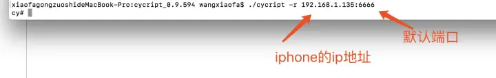 注意,核心步骤来了。首先保证iphone和Mac处于同一个局域网并且程序当前在运行态,条件缺一不可,然后终端下进入刚才解压的Cycript的目录下根据sokec(ip:端口)t连接手机,从而实现Cycript的动态注入代码。连接成功后如下图: